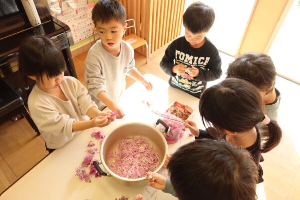 山形の秋と言えば芋煮、たんぽぽ組、あじさい組、すみれ組みんなで、しめじほぐしやこんにゃくちぎり、菊ちらしのお手伝いをしましたよ![]()