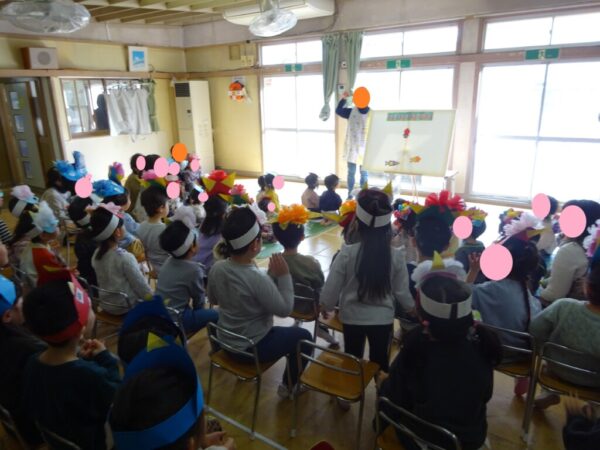 クラスごと鬼のお面を披露した後、鬼が苦手と言われている「ひいらぎいわし」の話を聞きました。