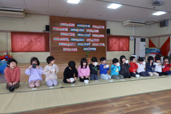 クラス毎にござに座り、すみれぐみさんが抹茶やお干菓子をお運びをしてくれましたよ。