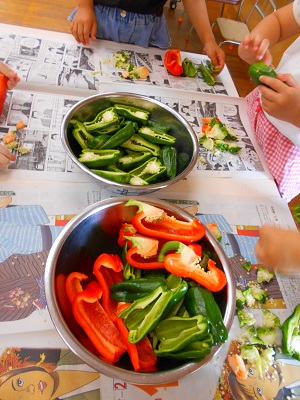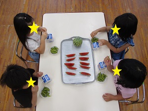 夏はおいしい食材がたくさんみんなで食育活動調理前に見たり触れたり給食室のお手伝いをしたり…様々な食材に親しんでいますたんぽぽ組・ひまわり組はピーマンの種取りもしました
