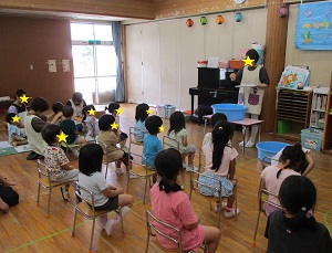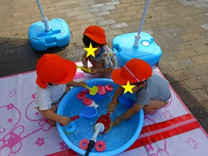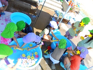 7月上旬から水遊びがスタートまずはみんなで安全祈願園長先生より、水遊びの約束について話を聞きましたそして、水の神様に「みんなが安全に楽しく水遊びができますように…」とお願いしました各クラス、水遊びを満喫しています