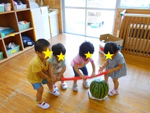 また、今年はひまわり組(5歳児)が植えたスイカがかわいくできました小さな小さなスイカでしたが赤くて甘くてとってもおいしかったですよー
