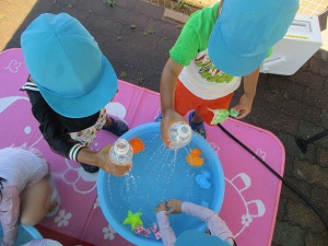 さくら組(3歳児) ペットボトルシャワーで「かんぱーい」