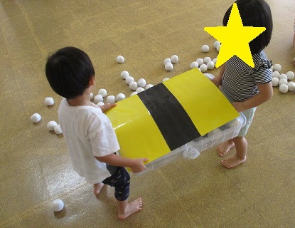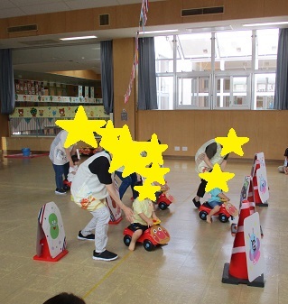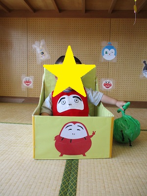 かわいいカートに乗ってだるまさんのトンネルをくぐるひよこ組さんでした