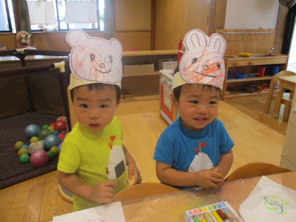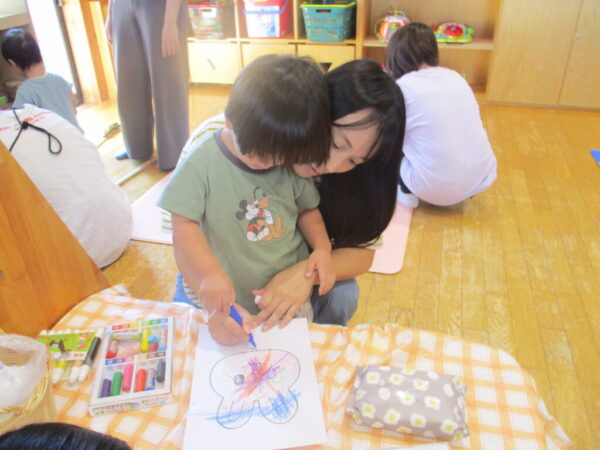 ママと一緒にクレヨンを使ってお面作りをしました!
