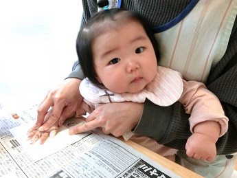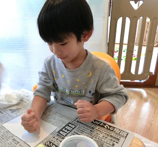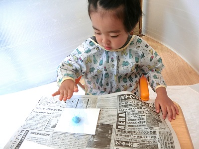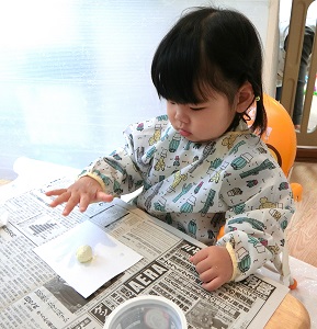 フェルトボールに絵の具を染み込ませた物を画用紙の上に置いて手で叩き、絵の具が飛び散るのを楽しみました🎵