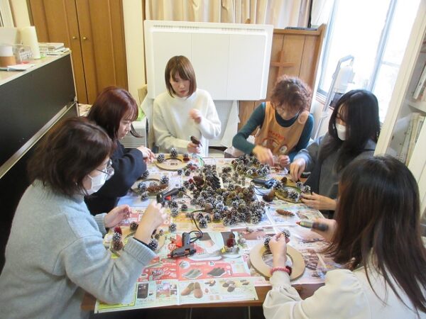 いつも子育てに奮闘中のママ達にはリース作りで、少しの間リフレッシュ・・・子供たちが公園で拾ってきた松ぼっくりを使って、可愛いリースができましたよ![]()