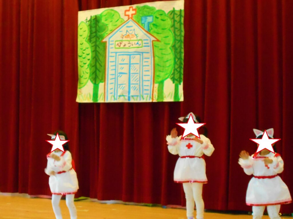 子ども達は、「ねこのおいしゃさん・おくさん・ねずみ・うさぎ・きりん・きつね」の役になって登場