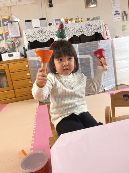 先生たちのオカリナとハンドベルのクリスマスソング演奏に合わせて、子どもたちも好きな楽器を鳴らしたり♬