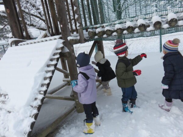 園で1番大きいクラスのらいおん組さん達は、みんなで協力して大きな雪だるまを作ったり、アスレチックにできたつらら探しをしたりと、冬の自然に触れて遊びを深めています。