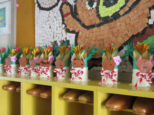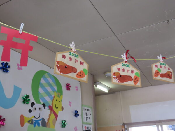 すみれ保育園の玄関に入ると、子ども達が製作した門松や絵馬などの正月飾りでにぎわっています。![]()