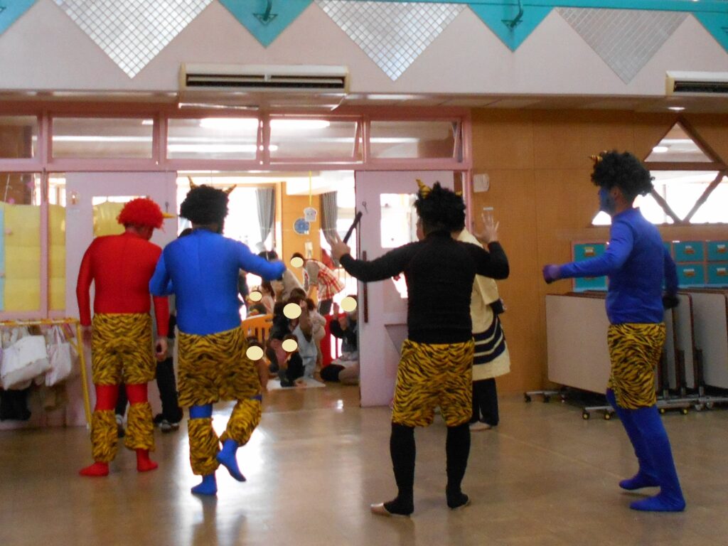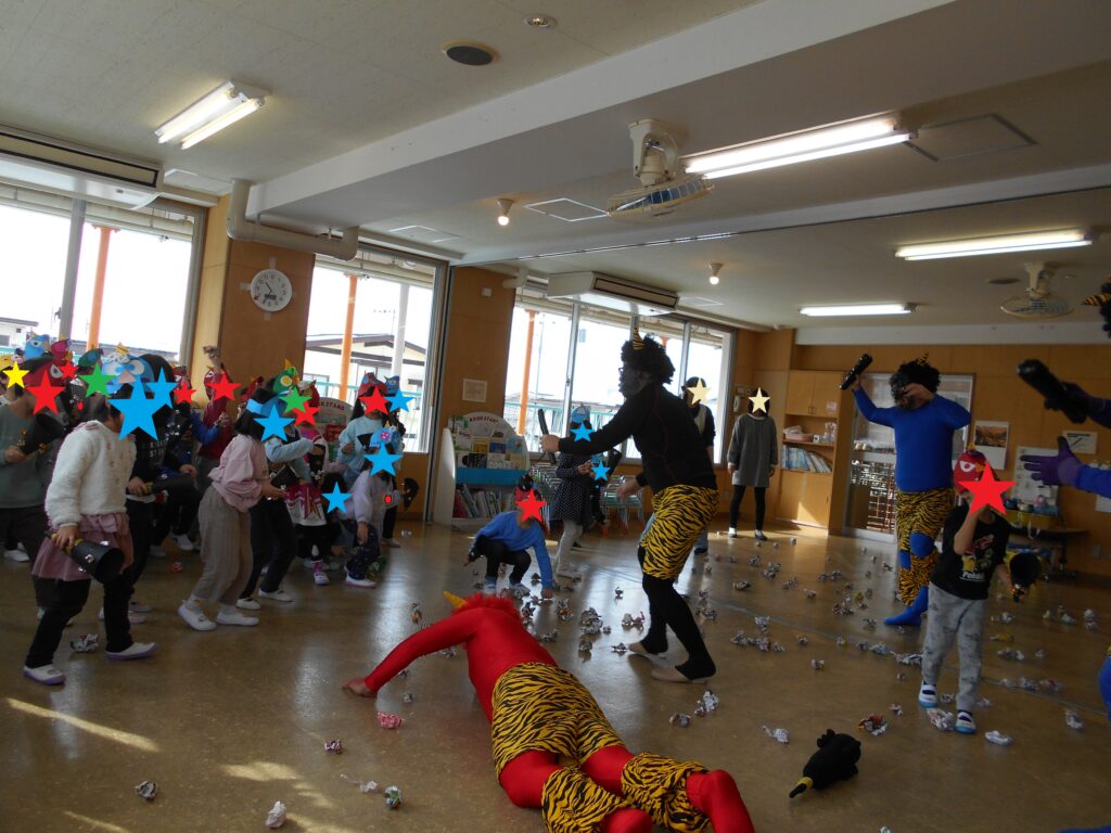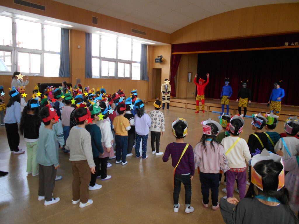 鬼の正体は、子ども達の心に潜む「おこりんぼ鬼・泣き虫鬼・好き嫌い鬼・いじわる鬼」でした。みんなで退治できてよかったですね![]()