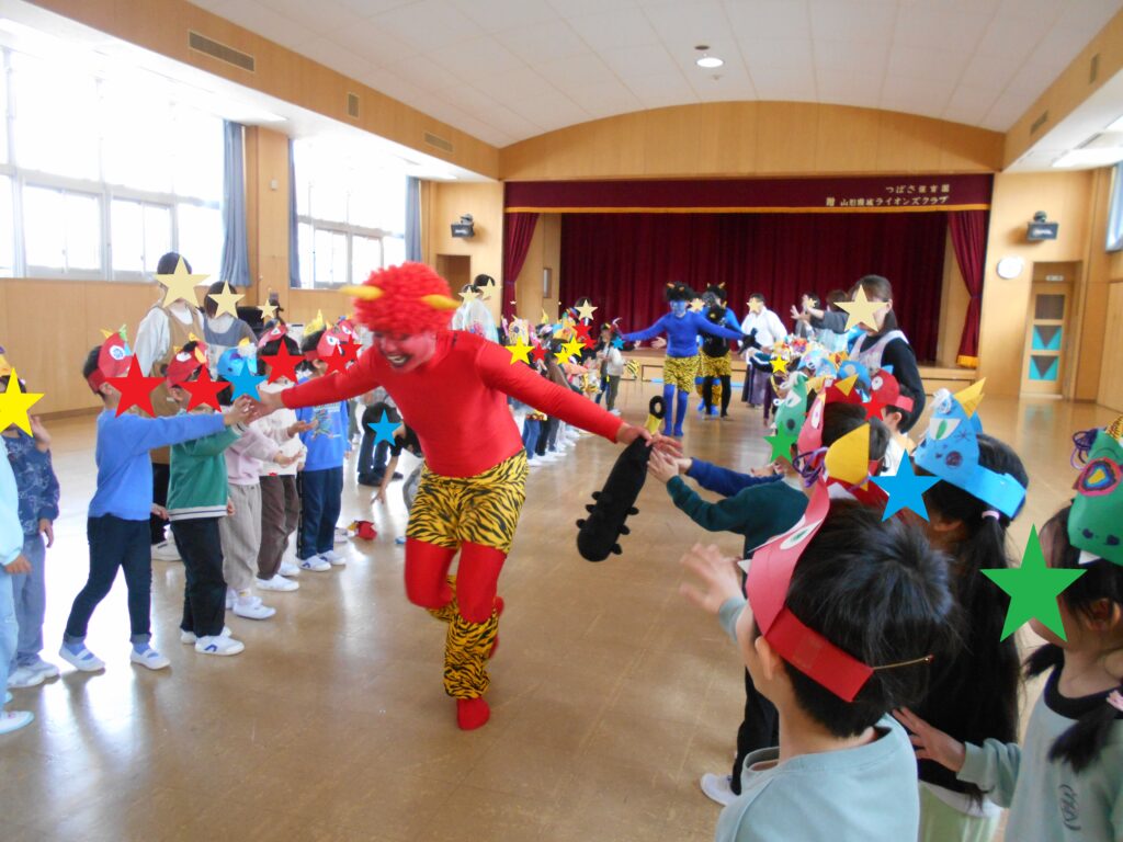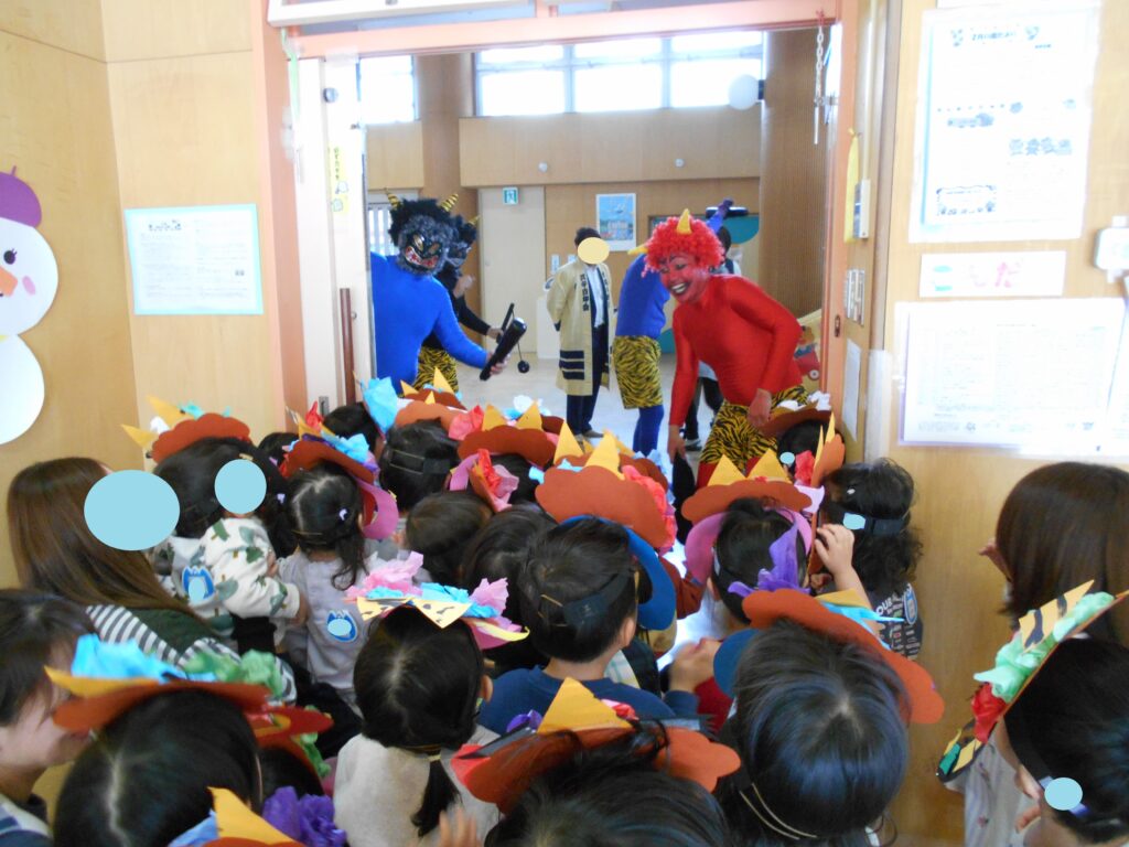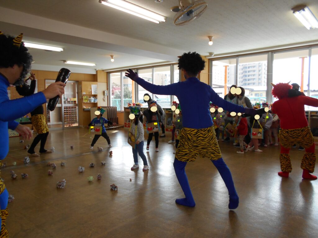 ちょっぴり涙が出そうなお友だちもいましたが、友だちと協力して豆を投げ、最後には面白くて優しい鬼たちと仲良くなりました![]()