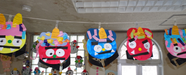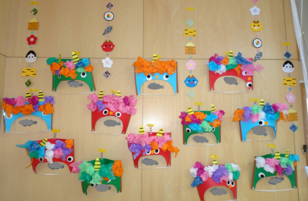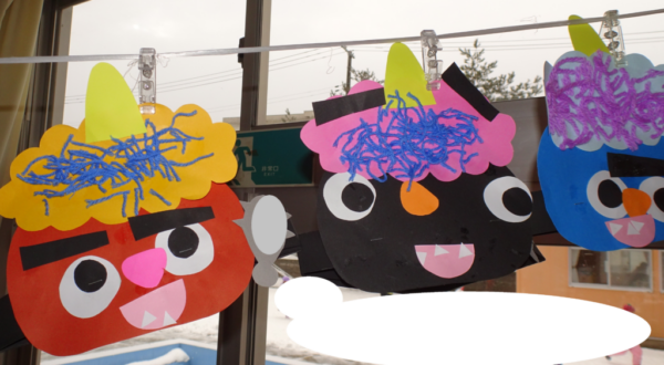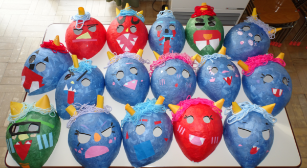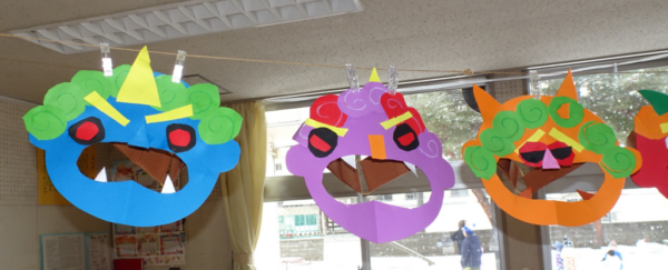 自分たちで色を塗った鬼の的に、新聞紙で作った豆を投げて退治しましたよ。