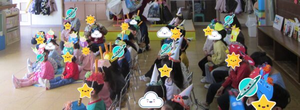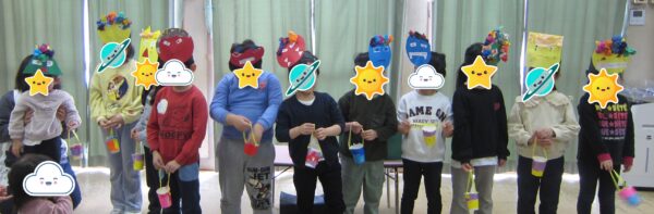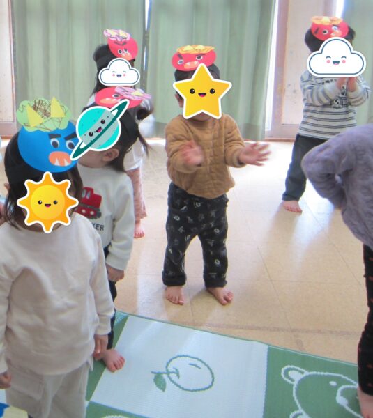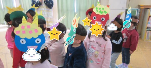 それぞれクラスで作った鬼のお面をかぶってお遊戯室に大集合しました!