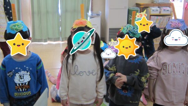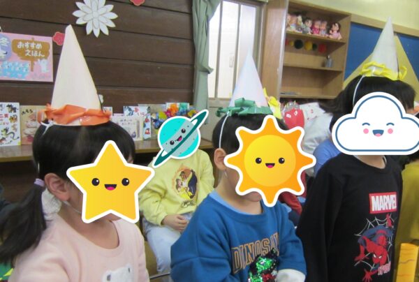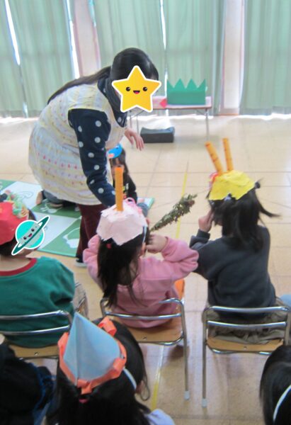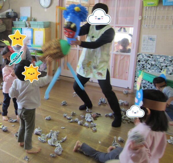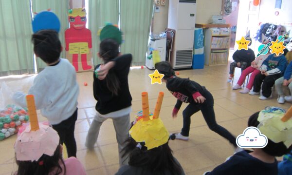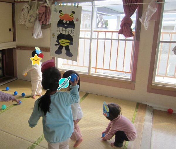 そのあとはクラスに戻り、カラーボールや新聞紙で作った豆を使って豆まきをしました。