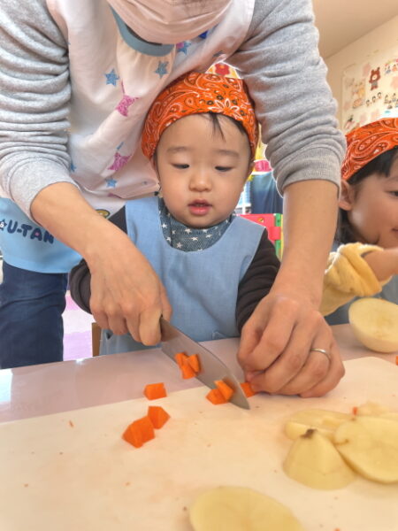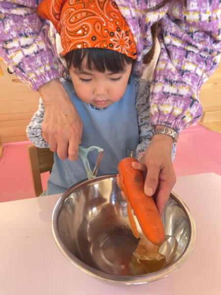 給食のシチューに入れる野菜の皮をむいたり、パンを成形したり
