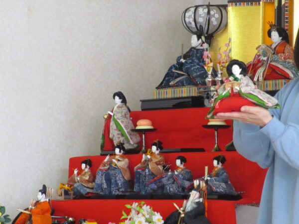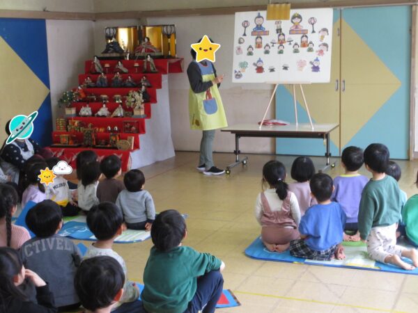 保育園に飾ったおひなさまを見ながら由来の話を聞いたり、