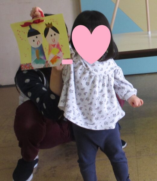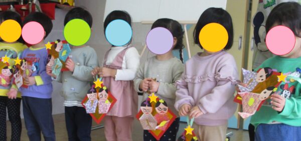 それぞれクラスで作ったおひなさまを持ち寄って、見せ合いっこをしましたよ❕