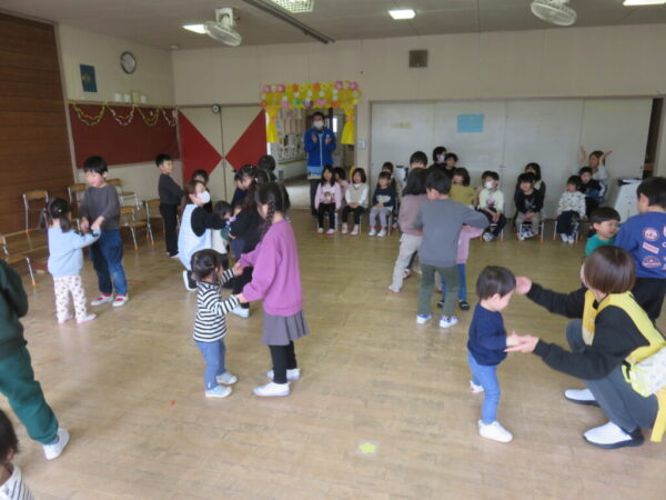 0,1,2歳児のお友達と年長組さんとでペアになり、一緒にフォークダンスを踊ったり、年長組さんへの質問コーナーがあったりと、子ども達の交流を深める楽しい時間となりました。![]()