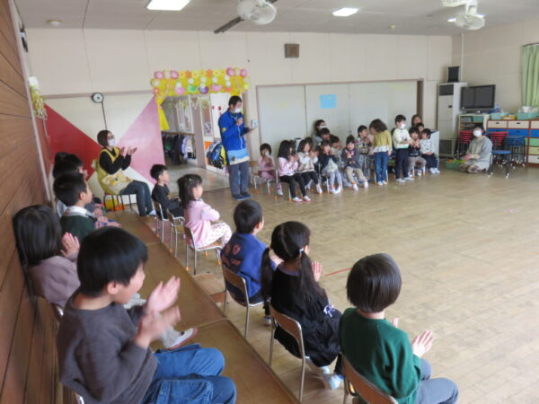 全園児で遊戯室に集まり、年中組さん達がリーダーとなって会を進行し、それぞれのクラスごとに出し物を披露してくれました!!![]()