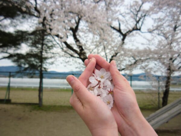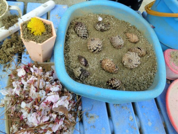 戸外遊びでは、桜の花びらなどの自然物を使ってごっこ遊びを楽しんでいます。