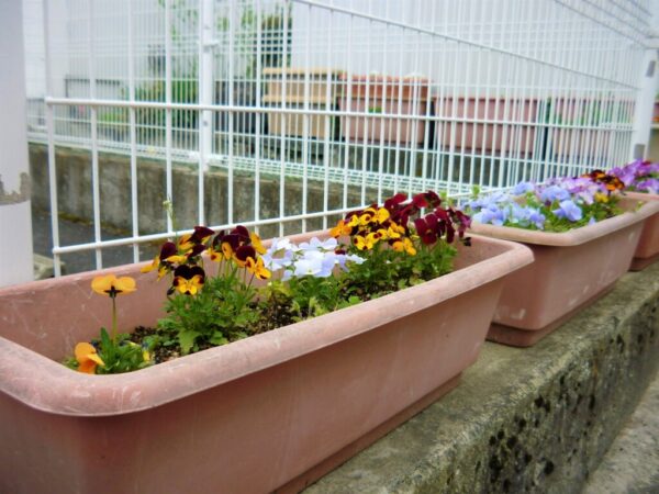 玄関には、かわいらしく花開いたパンジーなどのお花たちが子ども達を出迎えています