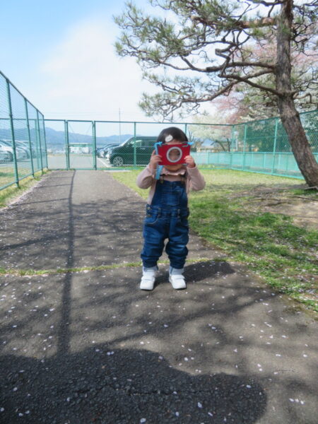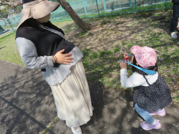 ソメイヨシノや枝垂桜の木の下で花びらを見つけたり、タンポポやつくしなど、春の草花に触れて戸外で散策を楽しむ子ども達でした!