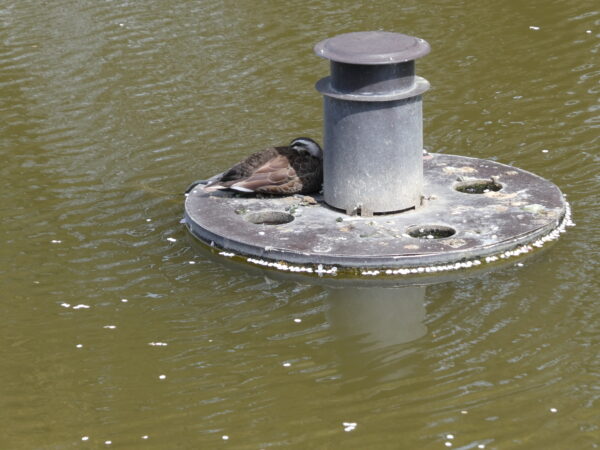 お堀の周りを歩いていると、日向ぼっこをしているカモが!