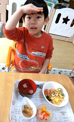 今日は行事食🍚鬼のオムライスや花型麩が入ったお吸い物を食べたよ😋🥰