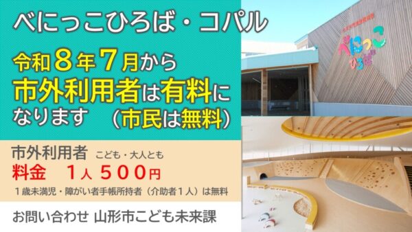 令和8年7月1日から、べにっこひろば、シェルターインクルーシブプレイスコパルの山形市民以外の利用者は入園料1人500円(こども・大人同一料金)が必要になります。